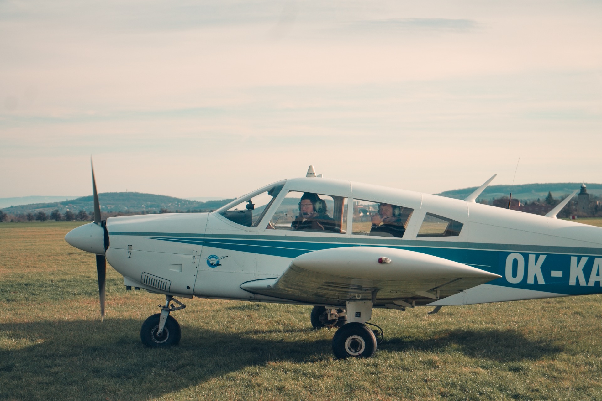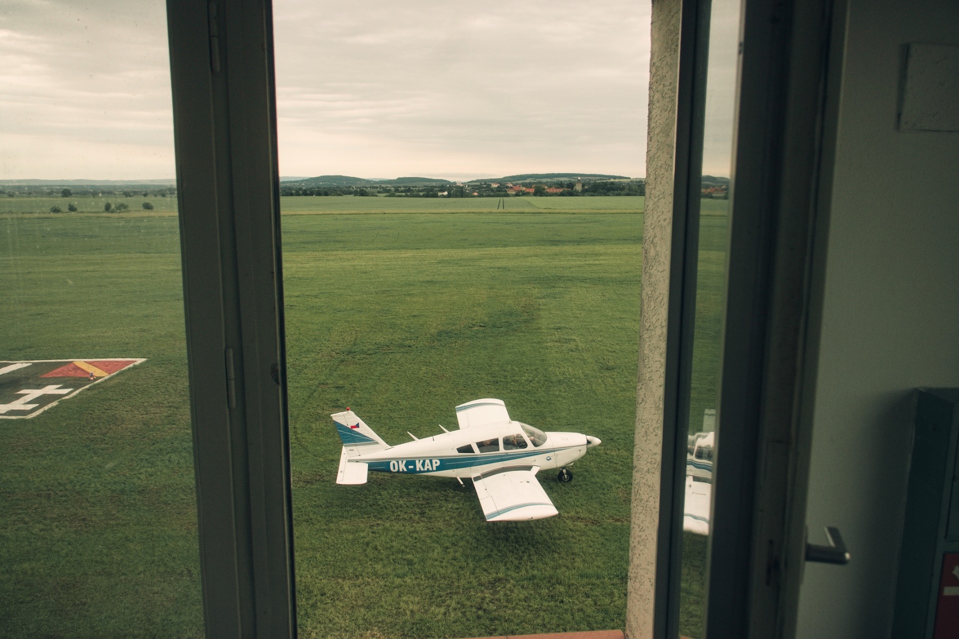Piper PA-28 OK-KAP vyfocen z věže kolínského letiště
